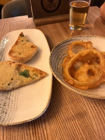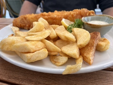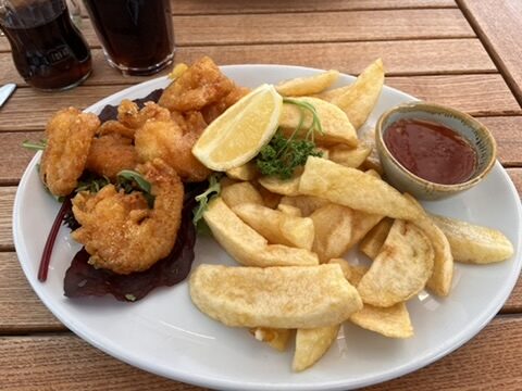 Anschließend ging es weiter Rock & Soul Place. Dort sollte es laut Internetrecherche die besten Fish und Chips der Stadt geben. Da wir relativ früh dort waren hatten wir Glück und haben draußen einen Tisch bekommen. Mein Freund hat natürlich, wie zu erwarten Fish & Chips bestellt. Ich habe mir gebackene Garnelen gegönnt.