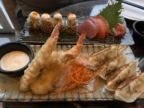 Zum Trinken gab es Champagner. Der war wirklich gut. Zu meinem Glück mag mein Freund keinen Champagner, so hatte ich mehr davon. Er hat sich dann einen Gin Tonic bestellt. Auch das Essen war nicht nach seinem Geschmack, aber was tut man nicht alles für seine Freundin. Es gab Sushi, Teigtaschen und gebackene Garnelen. Alles ganz nach meinem Geschmack, nur halt eben nicht nach seinem. Die Portion, die für zwei Personen gedacht war, war sehr übersichtlich. Für eine Person war es in Ordnung. Zum Nachtisch gab es Mochi. Die waren super lecker und haben sogar meinem Freund geschmeckt.