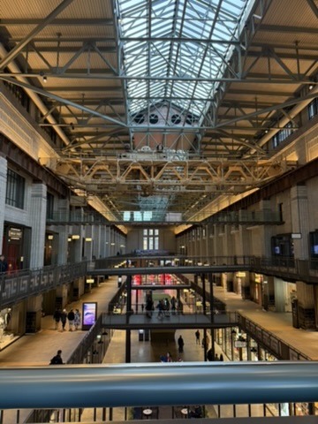 Zu Fuß machten wir uns dann auf den Weg zur Battersea Power Station. Entlang der Themse war es ein schöner Spaziergang. Ich war ein wenig irritiert von den motivierten Joggern in kurzer Hosen und kurzen T-Shirts bei ambitionierten minus 5 Grad. Wir wollte nur schnell ins Warme. Leider war die Battersea Power Station offen wie ein Scheunentor und entsprechend kalt zog es durch das Haus. Aber davon ließen wir uns nicht beeindrucken. Das Gebäude selbst war sehr imposant. Die Mischung aus Backsteinen und einer schwarzen Metallkonstruktion geben der Mall eine ganz besondere Atmosphäre.