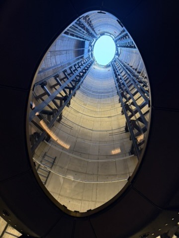 Dann geht sie auch schon los die wilde Reise. Mit bunten Lichtern und Geräuschen untermalt fährt der Aufzug durch einen der 4 Schornsteine nach oben. Oben ploppt man dann, wie eine steckengebliebene Seifenblase aus dem Schornstein. Leider war das Wetter bei unserer Fahrt nicht ganz so toll. Die Aussicht war dennoch beeindruckend. Wir konnten im Aufzug herumlaufen, sodass man einen kompletten Rundumblick genießen konnte.