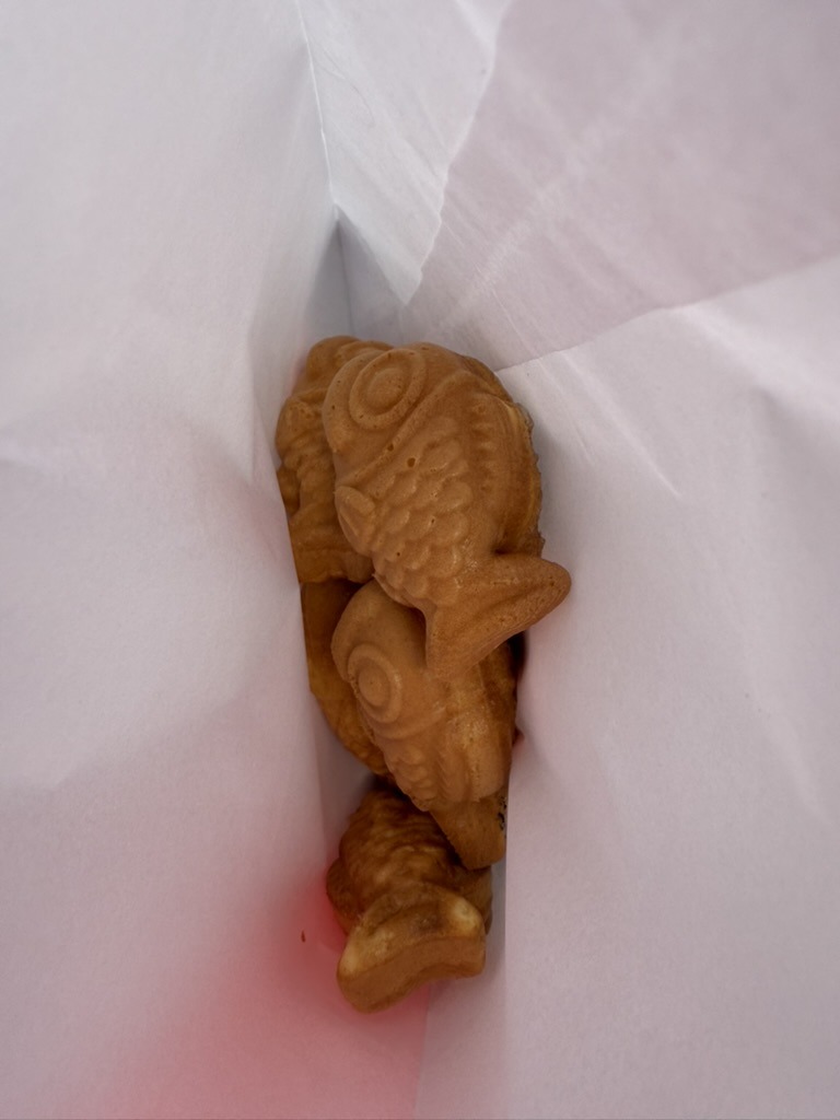 Im Netz bin ich auf kleine Fisch Küchlein gestoßen und wollte diese natürlich ausprobieren. Es war gar nicht so einfach in China Town eine Bäckerei zu finden, die diese kleinen Fische anbietet. Wir haben zwei Läden gefunden. Da der eine noch geschlossen hatten entschieden wir uns logischerweise für den anderen. Hier gab es nur eine Variante der kleinen Tiere. Sie wurden frisch zubereitet und waren noch sehr heiß. Die cremige Füllung schmeckte ein bisschen nach Vanille. Fazit: witzig und lecker