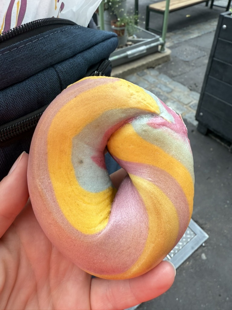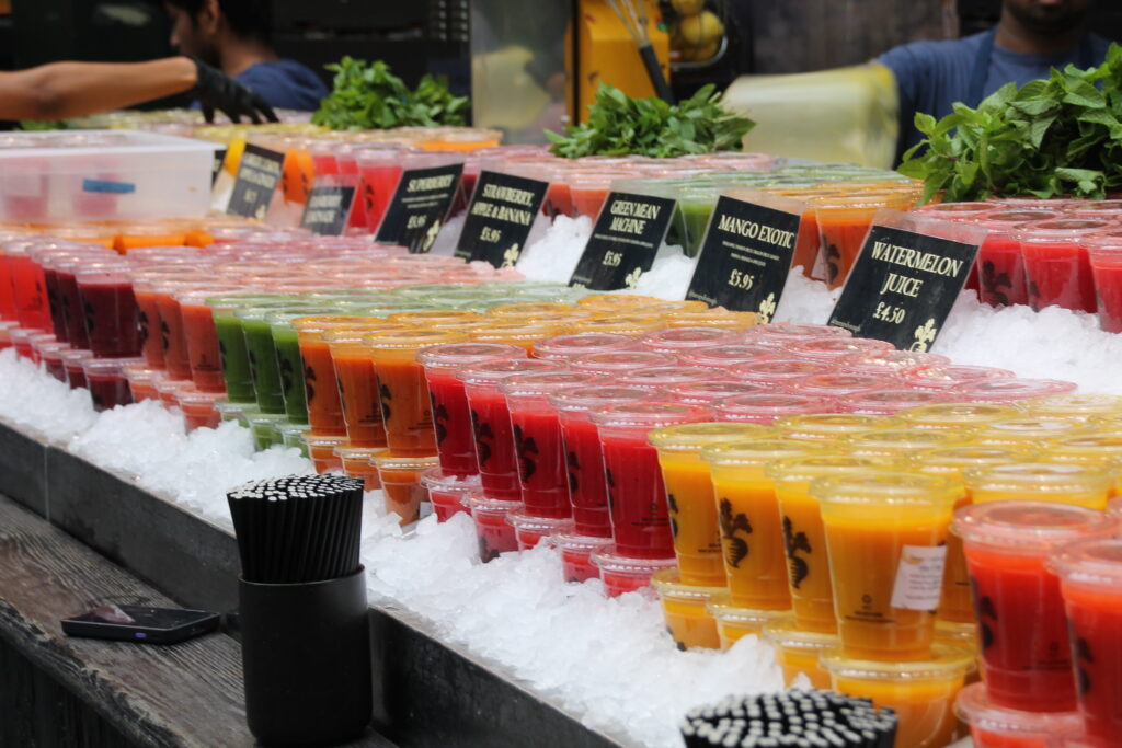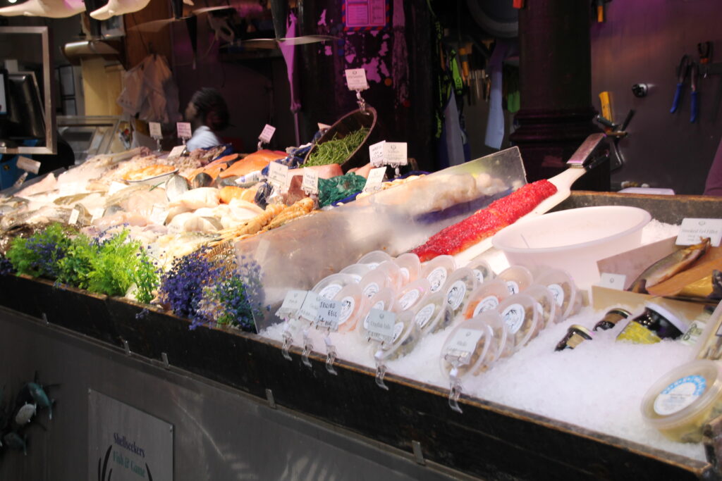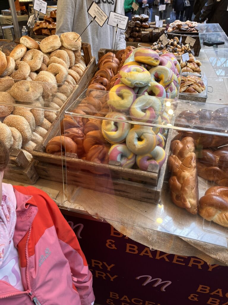 Der Borough Market ist so ziemlich mein Lieblingsmarkt. Bei unserem ersten Aufenthalt sind wir eigentlich nur zufällig daran vorbei gekommen. Ich habe mich gleich in die Atmosphäre und die Stände verliebt. Seitdem kommen wir immer für einen kurzen Besuch vorbei. Der Markt ist überdacht und bietet auch bei schlechtem Wetter ein tolles Erlebnis. Es gibt wirklich tolle Lebensmittel (Fisch, Wurst, Käse, Backwaren, Obst usw.). Einige der Früchte habe ich nie nie zuvor gesehen. Ein Highlight sind die Regenbogenbeigel. Die Beigel gibt es auch als Schokovariante oder ganz klassisch. Aber der Markt hat neben den normalen Verkaufsständen auch einen Food Market auf der anderen Seite der Halle. Dort gibt es kulinarische Leckerbissen aus aller Welt. Das gute bei den meisten Lokalen ist, dass die angebotenen Speisen auf Teller als sogenannte „Ausstellungsstücke“ präsentiert werden. So kann man sich ein gutes Bild von den Gerichten machen. Das hilf beim Entscheiden. Zur Mittagszeit ist dort sehr viel los. Wer es eher ruhig mag, sollte die Mittagszeit meiden und es etwas später versuchen.